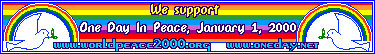 You can go visit the One Day in Peace site. In particular you might want to visit there world leader responses. Or you can read ours by clicking on the World Leaders square.When we had the idea to get everyone in the world to think about World Peace at exactly the same time, we had no idea others around the world were already working towards declaring January 1st World Peace Day, or some synonymous equivalent. We support any group which is working towards this goal, such as One Day In Peace in Arizona, USA. Now that we know others are out there, and we will use this page to place sites working towards this goal on this page. You may have already visited Eric Van der Wyk's Love 2000 site through our Peace Net page. You can read on a little or jump right to our listing of groups who have stuff planned for January 1st 2000, and beyond.